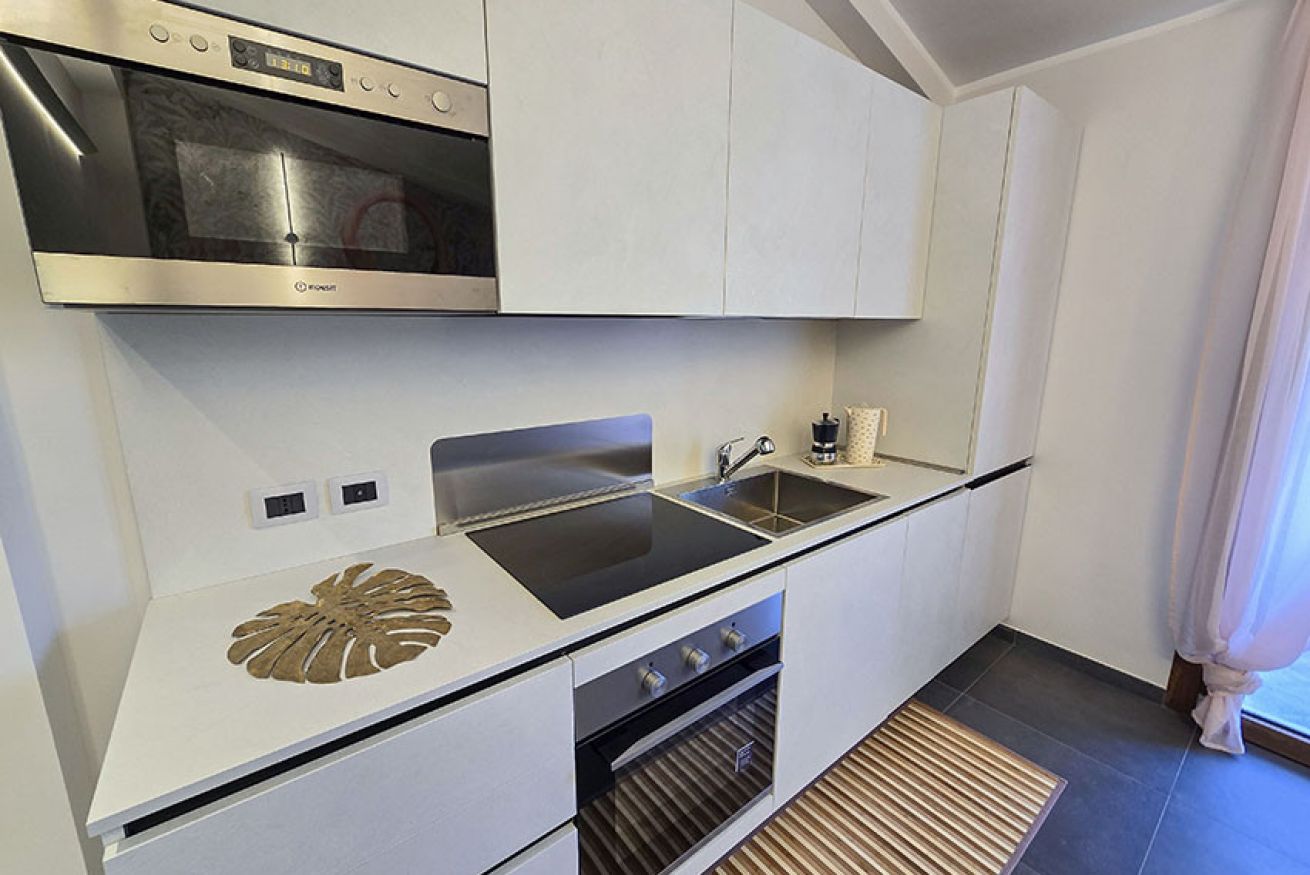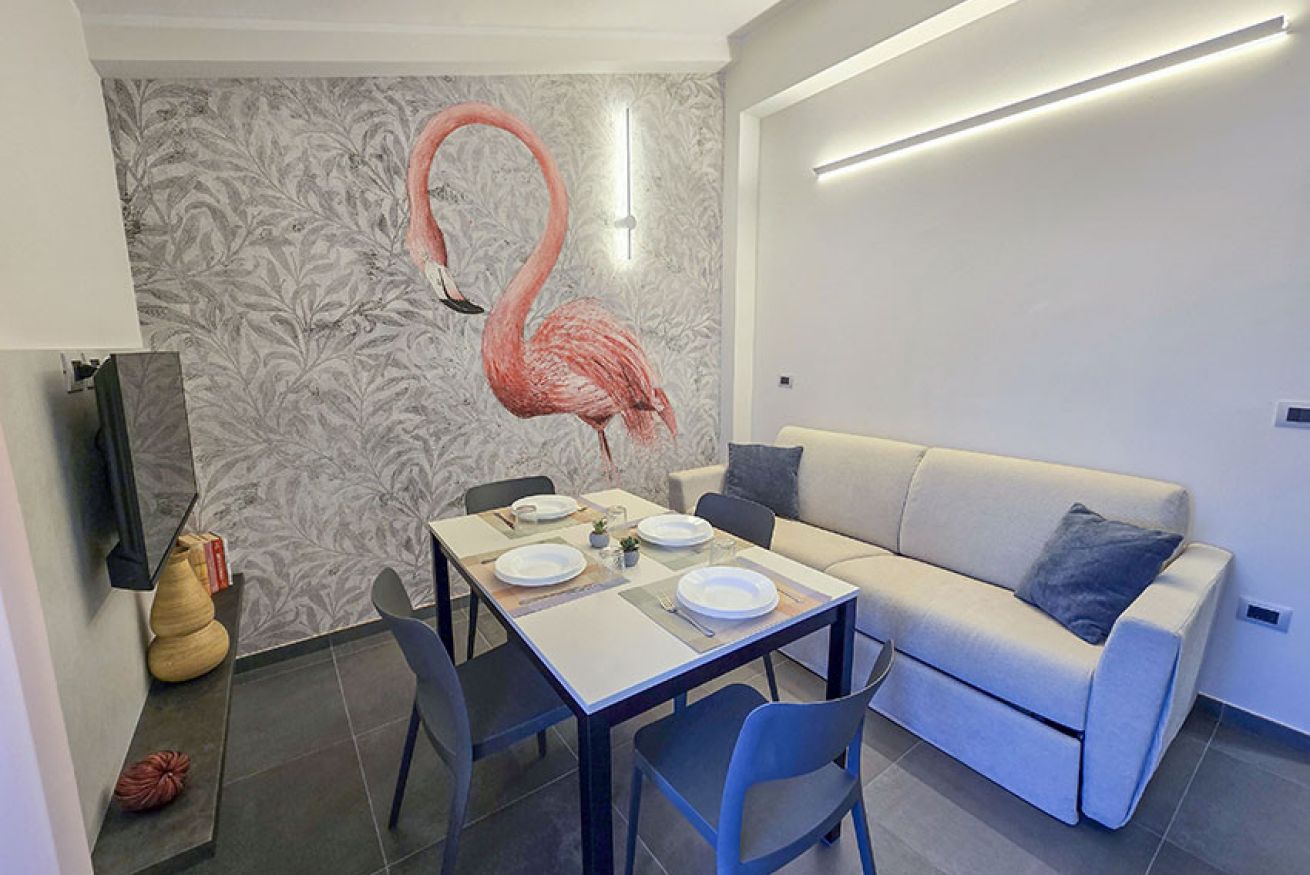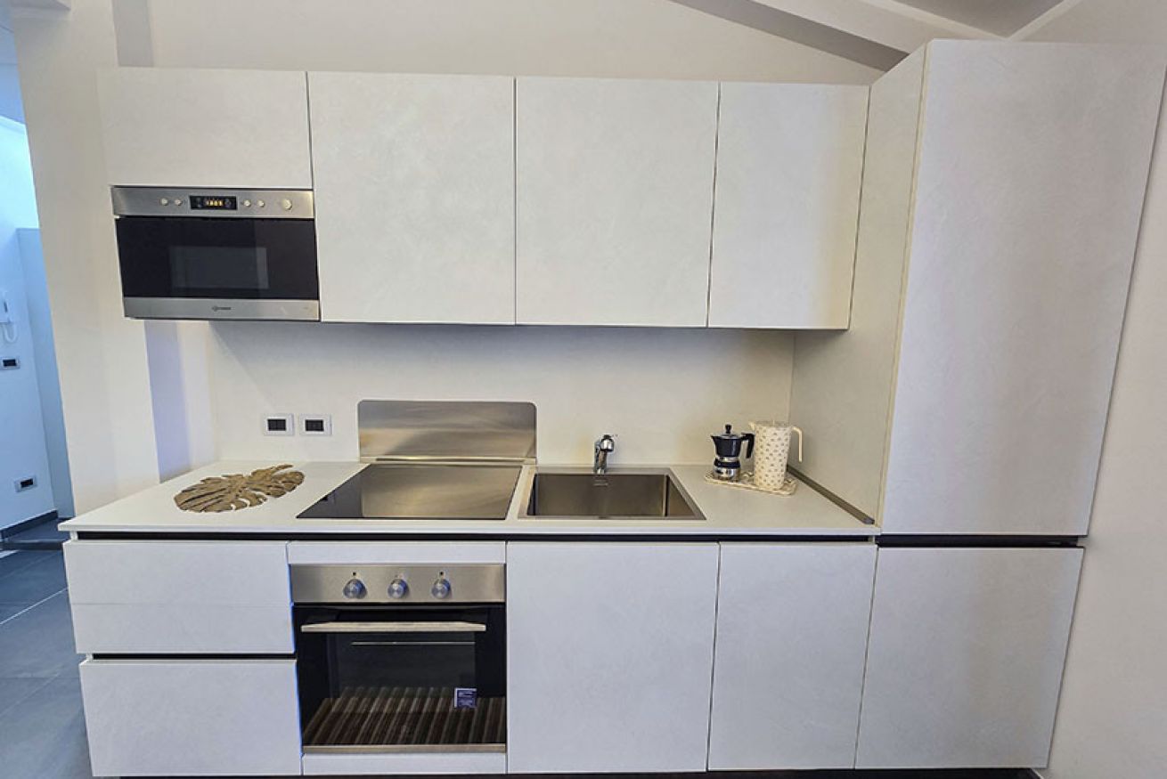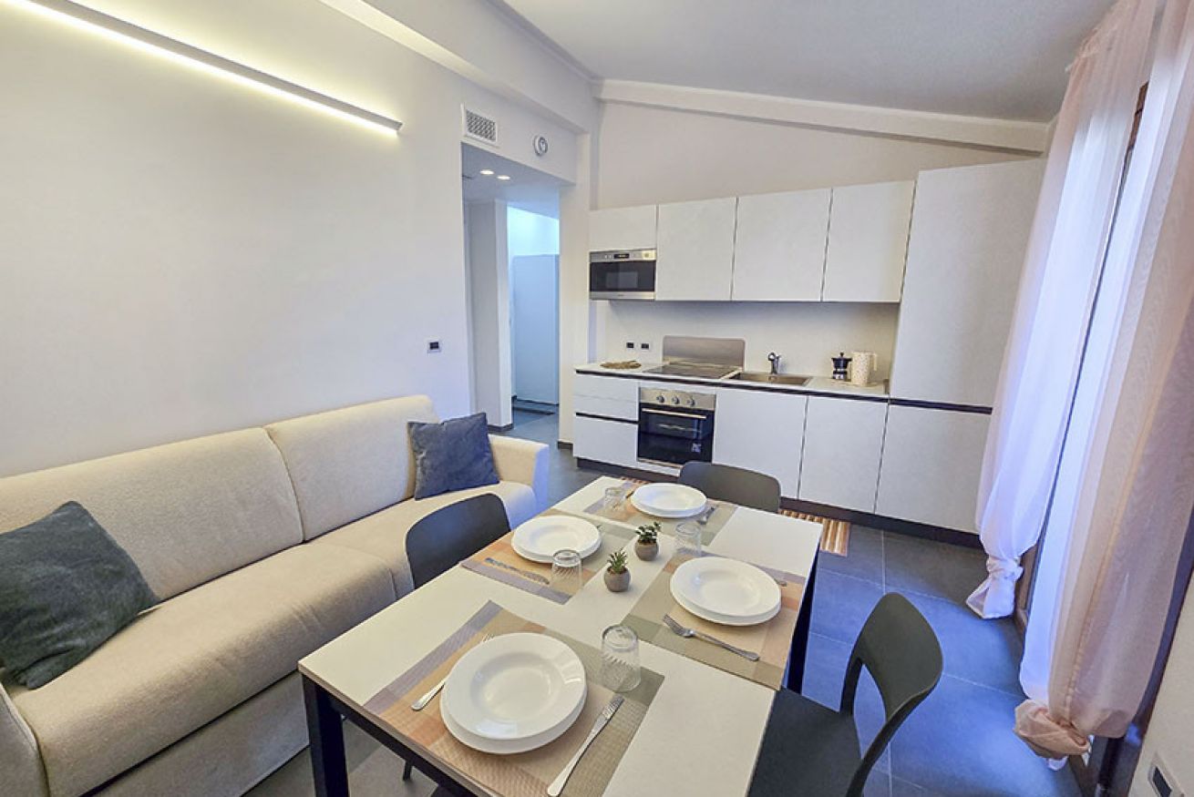 L'appartamento, di circa 55 mq, si compone di un’area living arredata con divano letto matrimoniale, tavolo da pranzo, smart tv 40” ed un’accurata illuminazione. La cucina, la cui portafinestra vi farà accedere ad un terrazzo con tavolo e due sedie, è accessoriata e corredata di ogni tipo d'utensile, piano induzione, forno microonde, lavastoviglie, forno e frigorifero. Dall'area living si accede ad un piccolo disimpegno dove si trova un armadio di servizio contenente la lavatrice e prodotti per la pulizia. Dal disimpegno si accede ad un bagno dallo stile moderno, dotato di sanitari, lavabo, mobile bagno ed un box doccia.
