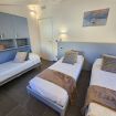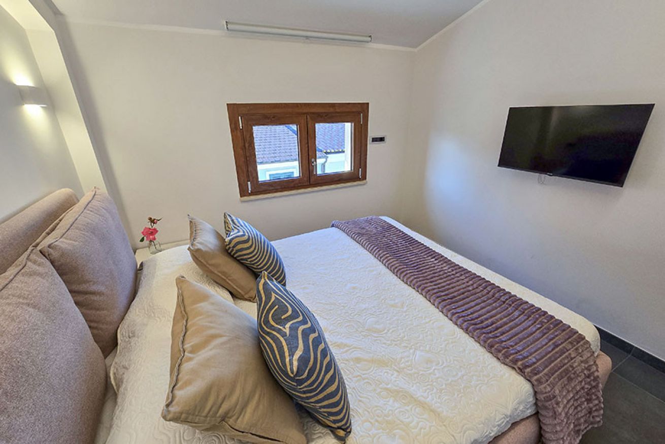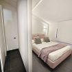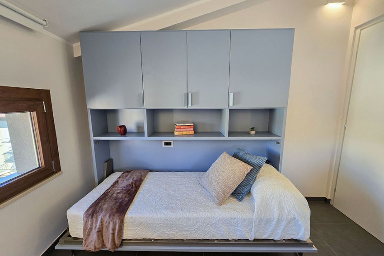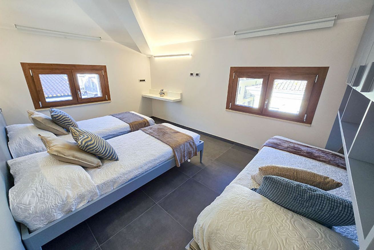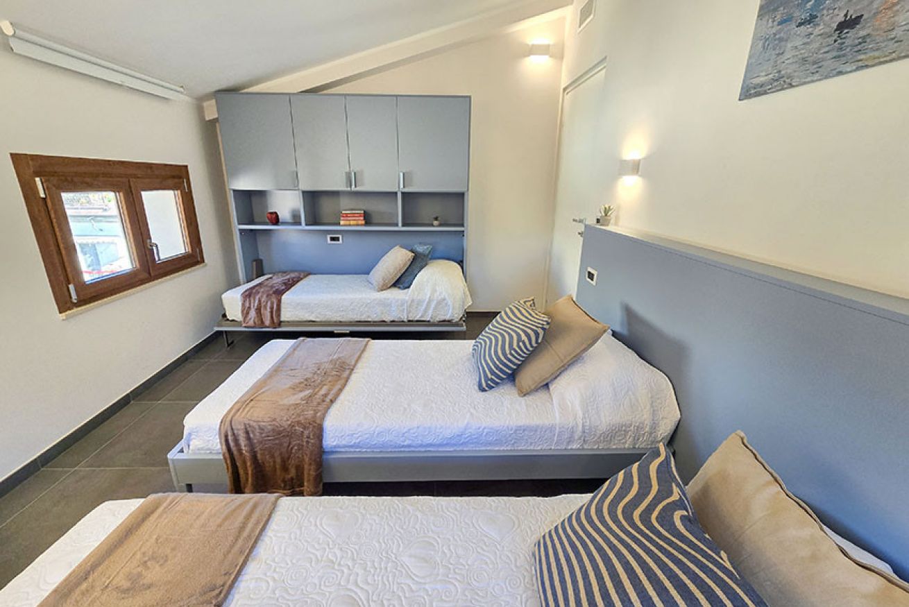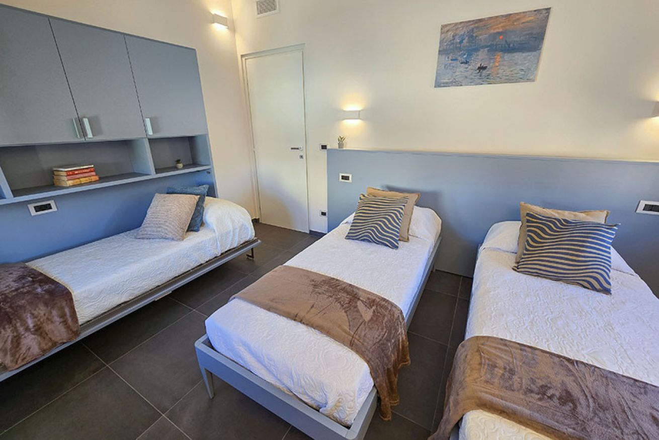 L’area notte è composta da una stanza con due letti singoli e un terzo letto a scomparsa, armadio, desk e da una seconda stanza matrimoniale dotata di smart tv 32”, armadio e desk.